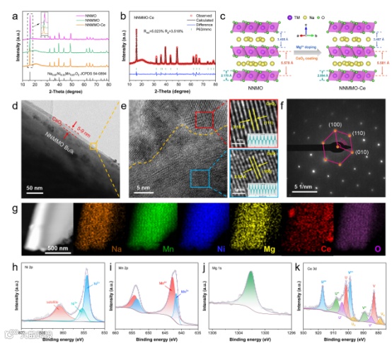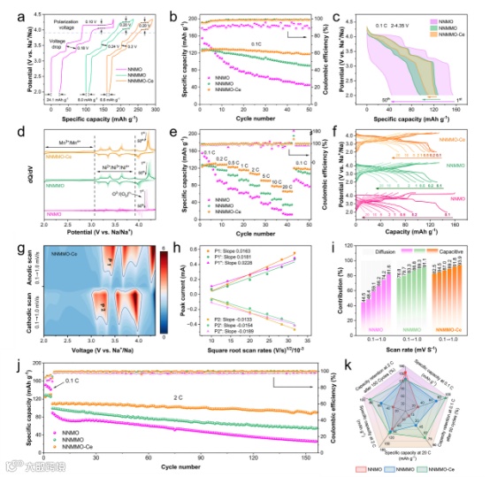 图5. NNMO、NNMMO及NNMMO-Ce在半电池配置下的电化学性能对比。