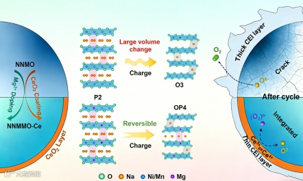 图1. P2型镍锰基材料中 Mg2+掺杂与CeO2包覆的协同作用机制。