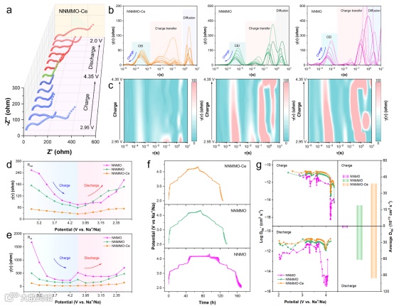 图3. NNMO、NNMMO及NNMMO-Ce的原位阻抗与动力学分析。