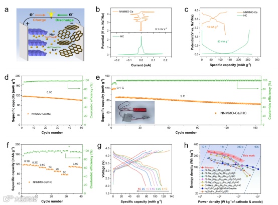 图6. NNMMO-Ce//HC钠离子全电池性能。