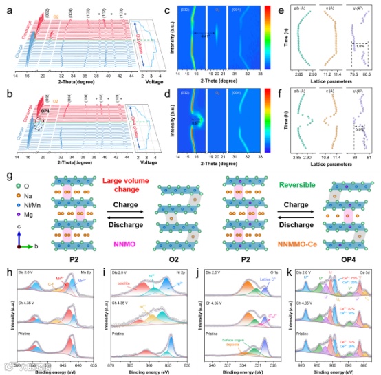 区别于传统惰性包覆层,CeO2包覆层展现出独特的化学-机械协同保护机制。CeO2具有丰富的氧空位和可逆Ce3+/Ce4+氧化还原对,充电时Ce3+氧化为Ce4+并捕获从体相迁移出的晶格氧填补氧空位,放电时氧离子可逆释放回体相,有效抑制晶格氧的不可逆流失。EPR和XPS证实循环过程中CeO2层氧空位浓度呈现周期性变化,直接证明其"氧存储-释放"动态缓冲作用。5-9 nm的超薄CeO2纳米层与基体形成共格界面,有效缓冲P2-OP4相变引起的晶格应变,防止颗粒内部裂纹扩展。循环后TEM显示NNMMO-Ce表面无贯穿裂纹,而NNMO出现严重碎裂。