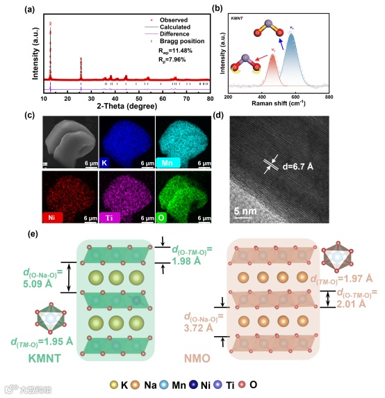 图 1 KMNT的结构表征:(a)经过里特维尔德精修的X射线衍射图谱;(b)拉曼光谱;(c)能谱元素分布图;(d)高分辨率透射电子显微镜图像;(e)KMNT和NMO的晶体结构示意图及晶格参数变化情况。