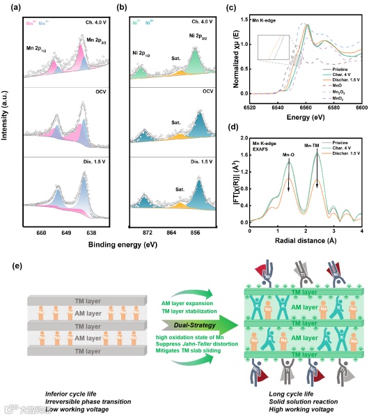 图 5 KMNT正极材料的XPS光谱分析:(a)Mn 2p能级;(b)Ni 2p能级;(c)、(d)在不同充放电状态下Mn K-edge XANES光谱及相应的EXAFS光谱;(e)双策略机制示意图。