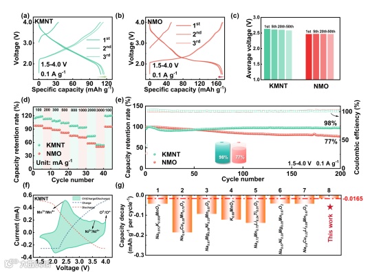 图 2 KMNT和NMO电极材料的电化学性能比较:(a)KMNT正极和(b)NMO正极在电流密度为0.1 A g-1时的充放电曲线,展示了前三个周期的情况;(c)平均放电电压;(d)在不同电流密度下的倍率性能;以及(e)在电流密度为0.1 A g-1时的循环性能;(f)KMNT正极在扫描速率为0.5 mV s-1时的循环伏安曲线;(g)KMNT与文献中报道的典型P2型正极材料的容量衰减对比。