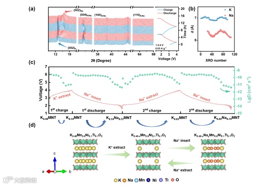 图 3 KMNT的钠储存机制。(a)KMNT正极的原位XRD图谱;(b)原位XRD过程中层间距d值的变化情况;(c)KMNT的GITT曲线以及计算出的K+/Na+传输系数;(d)充电/放电过程中KMNT结构的示意图。