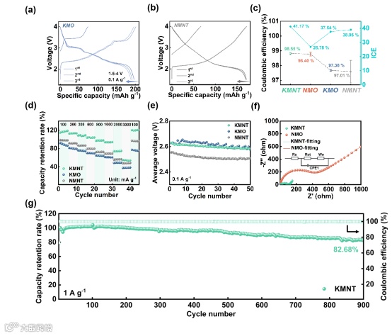 图 4 KMNT/KMO/NMNT电化学性能的比较。(a)KMO;(b)NMNT;(c)在电流密度为0.1 A g-1的条件下,200次循环的库仑效率比较;(d)三种正极的倍率性能比较;(e)放电平均电压比较;(f)KMNT的EIS谱图;(g)在电流密度为1 A g-1时KMNT的长循环性能。