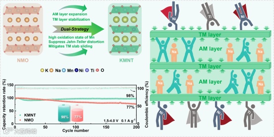 在P2型锰基正极中同时调控碱金属层和过渡金属层,通过K+柱撑扩大AM层,提升Na+扩散速率,同时通过Ni/Ti共掺杂压缩TM层,抑制Mn3+的Jahn-Teller畸变,实现结构双重稳定。