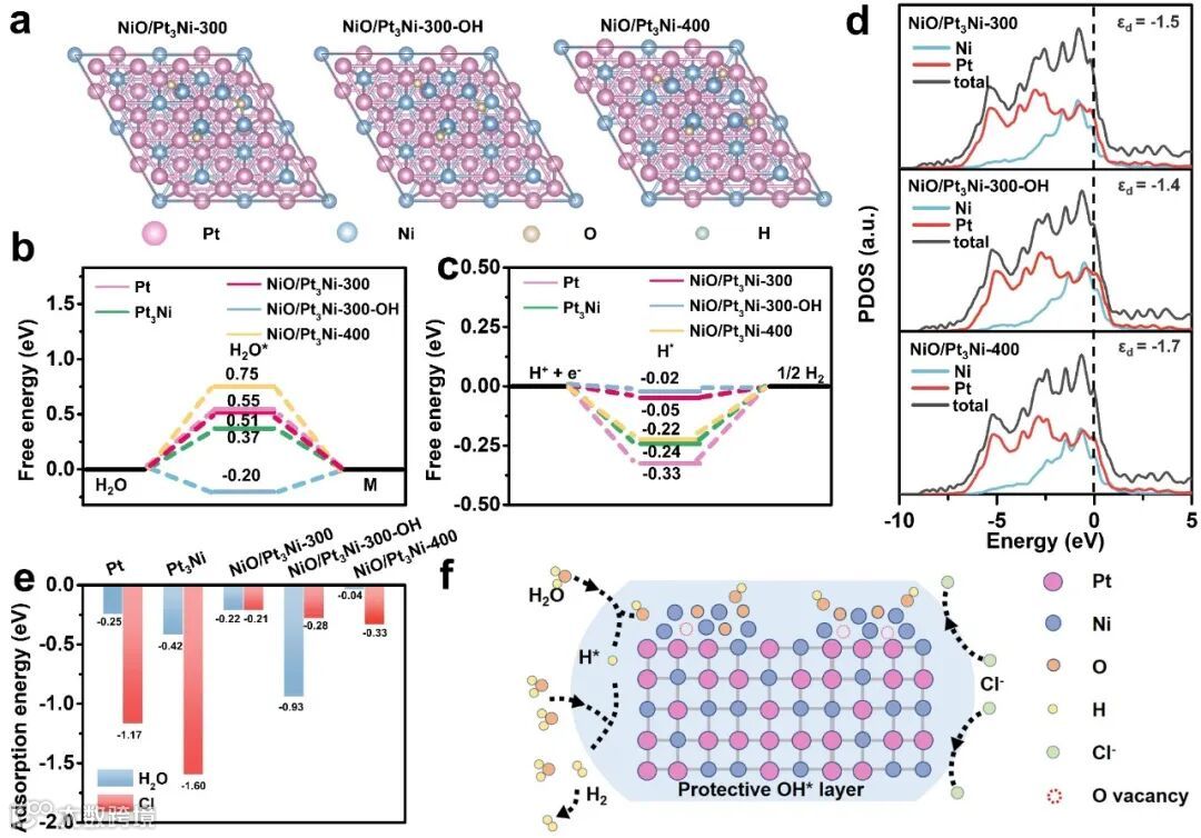 通过结合XRD、HAADF-STEM和XAFS结果构建模型并进行DFT计算,研究发现,NiO/Pt3Ni-300表面存在的羟基是其提升析氢性能与抗氯腐蚀的关键:羟基使催化剂具有极低的水解离自由能和氢吸附自由能,同时引起d带中心上移,这共同增强了水分子活化与反应中间体的吸附。此外,羟基基团显著抑制了氯离子的吸附并赋予表面高亲水性,从而优先吸附水分子并阻挡氯离子腐蚀,最终协同提升了HER活性与稳定性。