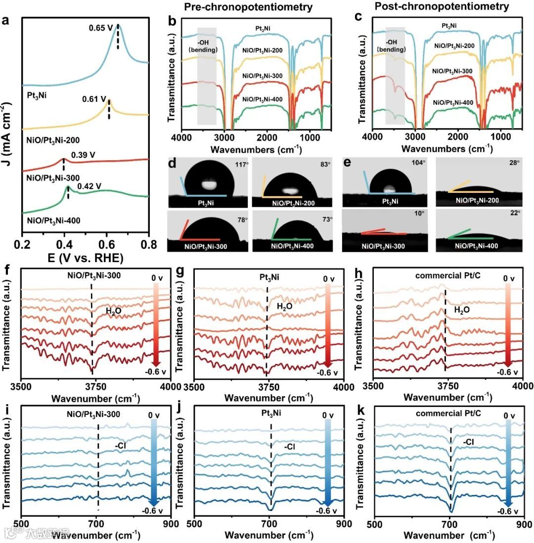 通过一氧化碳溶出伏安法与傅里叶变换红外光谱分析表明,NiO/Pt3Ni-300表面的羟基数量最丰富,这归因于其不饱和金属位点可有效促进水的解离并捕获OH。电解后催化剂因表面富含表面羟基而表现出更强的亲水性,NiO/Pt3Ni-300的接触角仅为10°,具有最佳的超亲水性。原位红外光谱进一步揭示,在析氢过程中,NiO/Pt3Ni-300表面水分子吸附显著增强,而氯离子吸附几乎不变,与Pt/C等催化剂形成鲜明对比。这表明,其表面因羟基富集诱导的超亲水性,可优先吸附H₂O并有效排斥Cl⁻,从而在提升催化活性的同时显著增强了抗氯离子腐蚀能力。