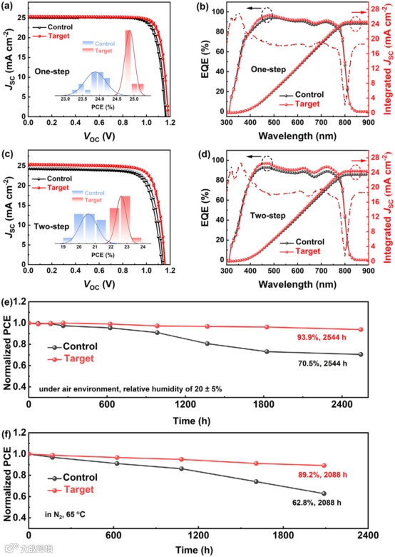 器件采用FAMACs-基(ITO/SnO2/EMIMS/perovskite/t-BBAI/spiro-OMeTAD/Ag)和FA-基(ITO/SnO2/EMIMS/perovskite/spiro-OMeTAD/Ag)的正型结构。以FAMACs-基钙钛矿为基础制备的EMIMS修饰的最优器件实现了25.20%的PCE,其中短路电流密度(JSC)为25.29 mA cm−2,开路电压(VOC)为1.19 V,填充因子(FF)为84.10%。相较于对照组器件的PCE 24.31% (JSC为25.08 mA cm−2,VOC为1.17 V,FF为83.13%),EMIMS提升了器件的JSC和VOC。稳定性结果显示,EMIMS优化后的器件展现出更加稳固的埋底界面结构,热稳、湿稳和光稳都得到了明显提升。(Figure 4和Figure S29支撑信息)