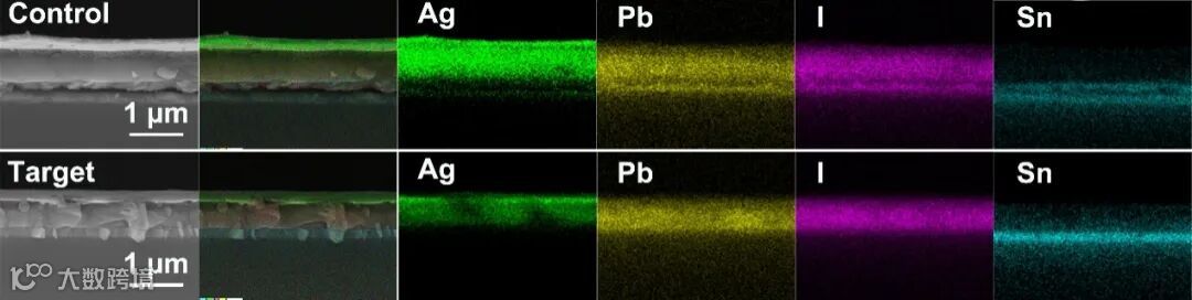 支撑信息图 29. 界面光(1-sun)热(65 ºC)老化前后的EDS图像。