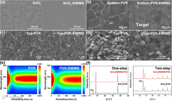图1. 未经EMIMS修饰/经EMIMS修饰的钙钛矿的形貌和晶体学研究。