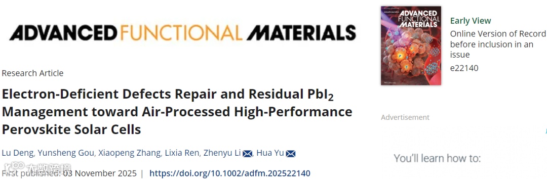 大湾区大学(筹)物质科学学院于华教授课题组与西南石油大学李振宇教授合作,在基于正式铯/甲脒/甲胺(CsFAMA)的钙钛矿太阳能电池方面取得新进展。相关成果以“Electron-Deficient Defects Repair and Residual PbI2 Management toward Air-Processed High-Performance Perovskite Solar Cells”为题发表在《Advanced Functional Materials》上。