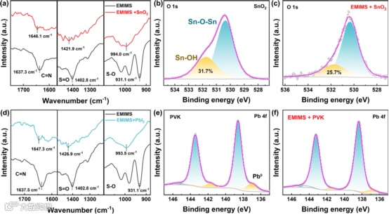 图 2. 研究EMIMS与SnO2以及FA基钙钛矿薄膜之间的相互作用机制。