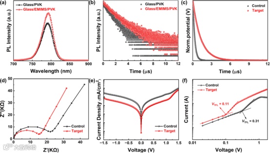 载流子动力学研究表明,EMIMS修饰后的界面非辐射复合显著降低,器件的电荷提取和转移能力显著增强。(Figure 3)