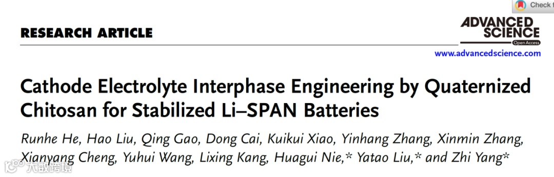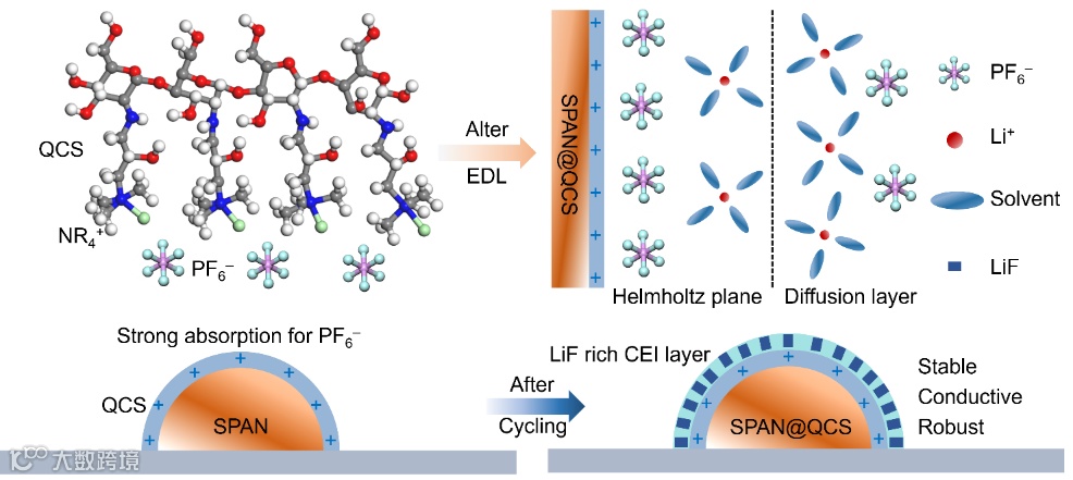 近日,温州大学杨植教授、聂华贵教授与北京化工大学刘亚涛副教授合作,在知名期刊Advanced Science上发表了题为“Cathode Electrolyte Interphase Engineering by Quaternized Chitosan for Stabilized Li–SPAN Batteries”的研究论文。该研究提出采用季铵化壳聚糖(QCS)作为功能添加剂,以优化SPAN正极的CEI结构。QCS表面具有的高正电荷密度能够选择性吸附PF6−阴离子,促进其在亥姆霍兹层富集,从而加速阴离子去溶剂化过程,推动形成富含LiF的阴离子衍生CEI膜。最终,所构建的CEI结构稳定且具备高离子导电性,显著提升了Li-SPAN电池的整体电化学性能。