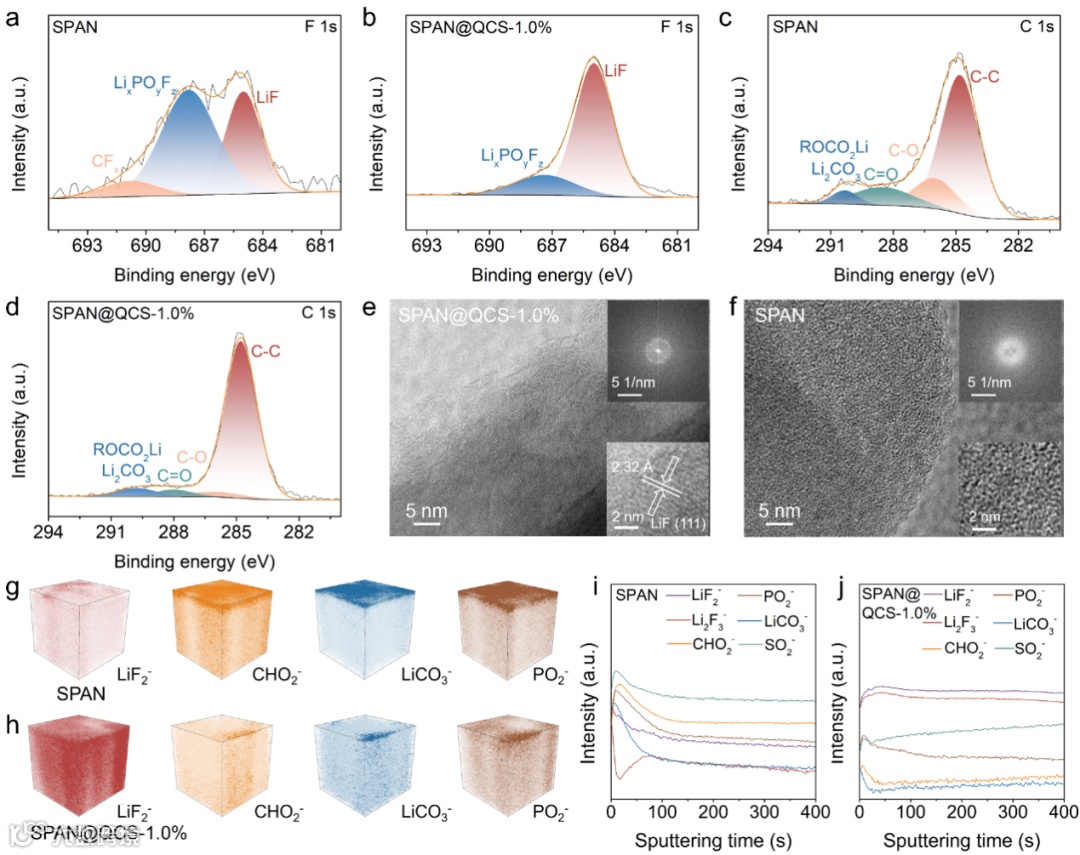 阴离子主导的亥姆霍兹层结构可促进SPAN表面形成富无机CEI层。XPS、HR-TEM测试结果表明在SPAN@QCS-1.0%电极表面存在大量的LiF,而烷基碳酸锂等有机成分含量则显著降低。飞行时间二次离子质谱(TOF-SIMS)显示LiF2−、CHO2−、PO2−与LiCO3−在3D mapping上呈重合分布,说明CEI为有机-无机复合相。与SPAN相比,循环后的SPAN@QCS-1.0%电极在三维视图中呈现显著增强的LiF2−信号及减弱的C2HO−/PO2−/LiCO3−信号,证实其CEI组分主要来自锂盐分解,而碳酸酯溶剂分解则被改性IHP结构有效抑制。