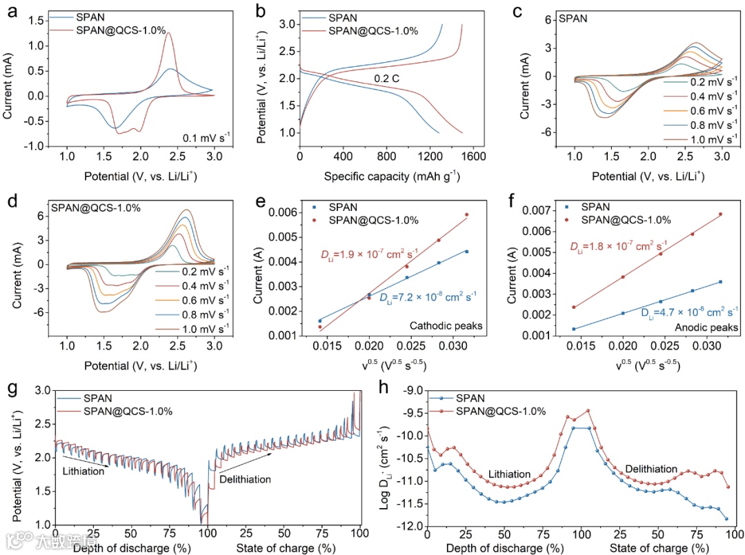LiF因其高模量、低锂离子扩散势垒及本征电子绝缘特性,是CEI的理想组分。当LiF与CEI中其他组分(如Li2O、Li2CO3、LiOH)形成界面时,可在晶界处呈现高离子电导率。因此,电极/电解质界面处离子载流子浓度的大幅提升可实现Li+的快速传输。测试结果显示,SPAN@QCS-1.0%电极在放电和充电时的Li+扩散系数分别为1.9×10−7 and 1.8×10−7 cm2 s−1,远高于纯SPAN电极的7.2×10−8 and 4.7×10−8 cm2 s−1,这对于提升SPAN电池的倍率性能至关重要。