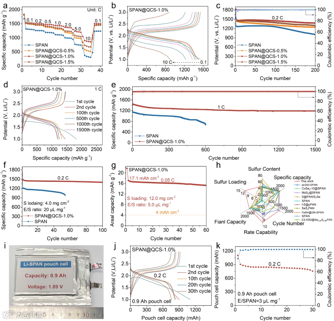 基于富LiF CEI的构建,SPAN@QCS-1.0%电极获得了优异的电化学性能,主要表现为三高,首先是高的倍率性能,10 C倍率下容量为902 mAh g−1,其次是高稳定性,1500次循环后容量保持率82%,最后是高的面容量,硫负载为12 mg cm−2时,面容量达到17.1 mAh cm−2,是商用锂离子电池的四倍多。基于SPAN@QCS-1.0%电极制备了容量为0.9 Ah的软包电池,其能量密度约为175 Wh kg−1,并能稳定循环超过30次,展现出了较好的实际应用潜力。