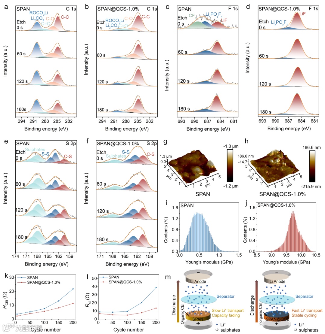 富LiF CEI可以进一步提升电极界面的稳定性,从循环后电极C1s XPS谱图中可以看到,SPAN@QCS-1.0%电极表面拥有更少的碳酸锂和烷基碳酸锂,说明其在循环过程中能有效抑制电解液的分解;F1S谱图对比可以看到经过循环后,SPAN@QCS-1.0%电极中的F物种仍以LiF为主;更重要的是,硫物种的相关界面副反应也得到了抑制,从S2P谱图对比可以看到,SPAN@QCS-1.0%电极表面的硫酸盐含量明显更少,这对SPAN正极稳定性的提升至关重要。此外,我们对循环后的电极进行了AFM测试,SPAN正极表面存在较厚覆盖层,这是电解质溶剂分解与活性材料-电解质副反应共同作用的结果。其较低的杨氏模量与表面疏松有机层的特性相符。而SPAN@QCS-1.0%正极则呈现更光滑均匀的表面形貌,杨氏模量高达约10 GPa,是SPAN电极的20倍。经过多次循环后,SPAN的电荷转移阻抗(Rct)和CEI阻抗(RCEI)均显著上升,而SPAN@QCS-1.0%正极的阻抗值变化不大,这进一步证实了SPAN@QCS-1.0%正极优异的界面稳定性。