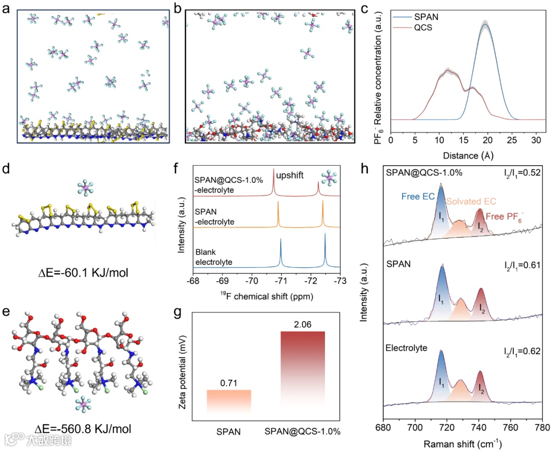 SPAN@QCS独特的表面特性可有效调控双电层(EDL)结构与电解质溶剂化环境。基于QCS层携带的正电荷特性,研究了其对电解质中PF6−阴离子的选择性吸附行为。分子动力学(MD)模拟显示,QCS表面对PF6−的吸附密度显著高于纯SPAN电极。QCS对PF6−的吸附能(-560.8 kJ mol−1)进一步证实了其强选择性吸附特性。这种强相互作用通过19F核磁共振谱进行了实验验证:PF6−峰位的低场位移表明其与溶剂作用减弱而与QCS结合增强。Zeta电位测试显示SPAN@QCS-1.0%具有更高正电位(+2.06 mV),显著高于SPAN(+0.71 mV),说明PF6−阴离子在SPAN@QCS-1.0%的内亥姆霍兹平面(IHP)优先富集。电解液浸泡电极材料后的拉曼光谱中游离EC(环弯曲振动,720 cm−1)与游离PF6−(P-F对称振动,741 cm−1)的特征峰强度比值I2/I1呈现规律性变化:SPAN@QCS-1.0%的比值(0.52)显著低于空白电解液(0.62)和SPAN(0.61),证实部分PF6−阴离子被QCS吸附固定。这进一步证明QCS修饰层对电解液中PF6−阴离子具有更强的吸附能力。