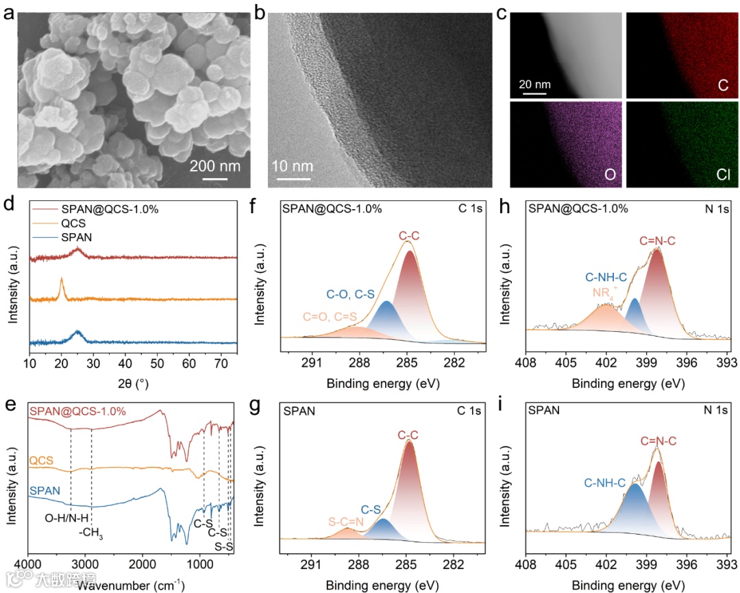 作为正极添加剂,QCS被直接加入到正极浆料中进行混合。由于具有出色的水溶性和成膜性,QCS和粘结剂一起包覆在电极颗粒表面,从SEM和TEM图片可以看到包覆层十分均匀。相应的EDS mapping图显示了QCS所含元素在材料表面的均匀分布。由于加入量较少,在复合正极的XRD谱图中难以观测到QCS的衍射峰。但是从红外光谱中可以看到-NH-基的振动峰。XPS分析则发现复合正极中C-O键的增强以及NR4+的存在,进一步证实了QCS对SPAN的成功包覆。