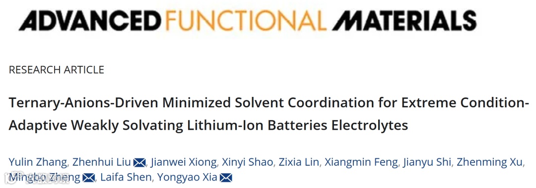 近日,南京航空航天大学刘振辉副教授,郑明波副教授、复旦大学夏永姚教授团队以四氢呋喃(THF)基电解液体系为基础,围绕三元阴离子协同调控策略开展了系统性研究。团队以计算模拟与多重表征为支撑,系统阐明了PF6⁻、TFSI⁻、DFOB⁻三阴离子在溶剂化结构调控、界面成膜以及铝集流体保护中的功能分工与协同机制;在此基础上设计的电解液体系在高压(4.5 V)、低温(-40 ℃)与快充(6 C)等多种苛刻条件下均展现出优异的性能,并在软包电池体系中得到验证。该研究为弱溶剂化电解液的设计提供了新思路,有望推动面向快充、低温场景的高性能电池电解液的工程化发展。相关研究成果发表于《Advanced Functional Materials》,第一作者为硕士生张宇霖。