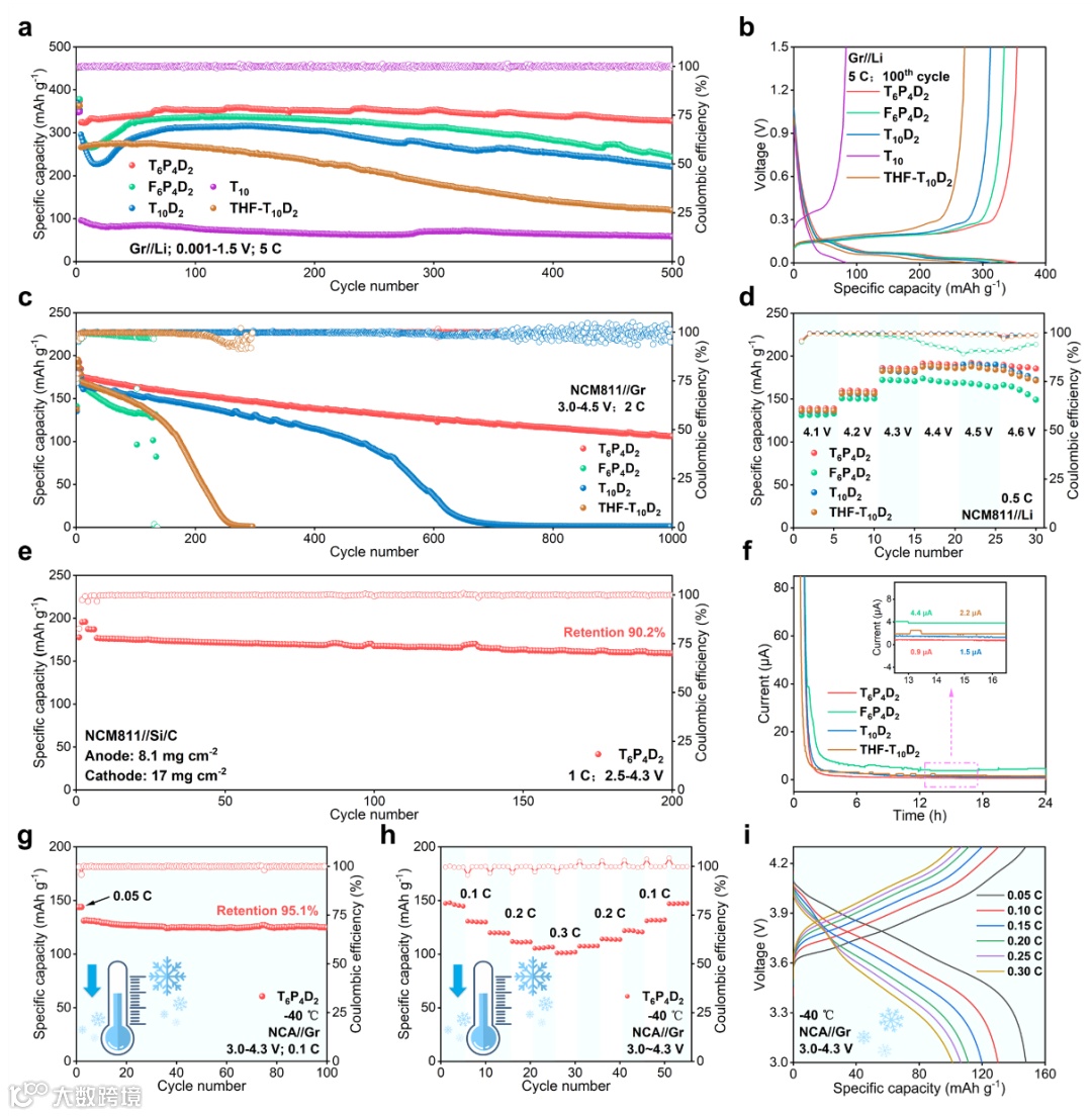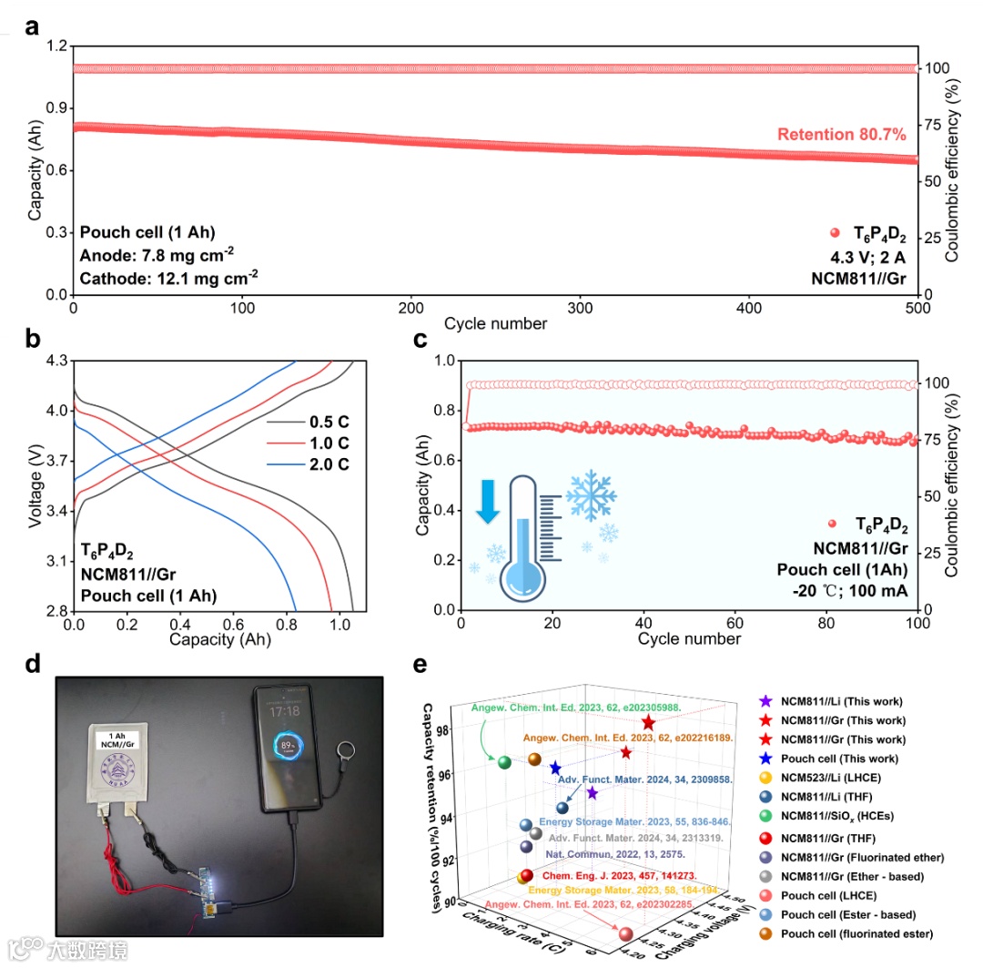 本研究设计的电解液体系实现了在多维度的优异性能:将THF基体系(97 vol%)的稳定工作电压拓展至4.5 V;基于该体系的NCM811//Gr全电池在6 C高倍率快充条件下循环2000次后容量保持率达76.8%,在-40 ℃低温环境下循环100次后容量保持率为95.1%;所组装的软包电池可实现超过500次的稳定循环。此外,该体系在高负载量的NCM811//Si/C全电池中也表现出具有竞争力的电化学性能,进一步展现出其良好的普适性与应用前景。