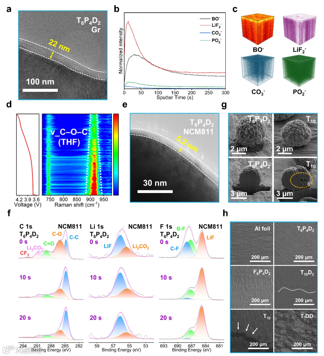 本工作提出并验证了一套以PF6⁻、TFSI⁻和DFOB⁻为核心的三元阴离子协同策略。具体来说,TFSI⁻作为主要阴离子参与溶剂化结构的构建;DFOB⁻作为功能性锂盐优先在电极界面分解,与TFSI⁻协同调控SEI/CEI的形成,并有效清除PF6⁻分解产生的HF,抑制相关副反应;PF6⁻则在铝集流体表面形成富含AlF3的无机钝化层,有效防止TFSI⁻对铝箔表面的腐蚀,显著提升体系在高电压下的稳定性。