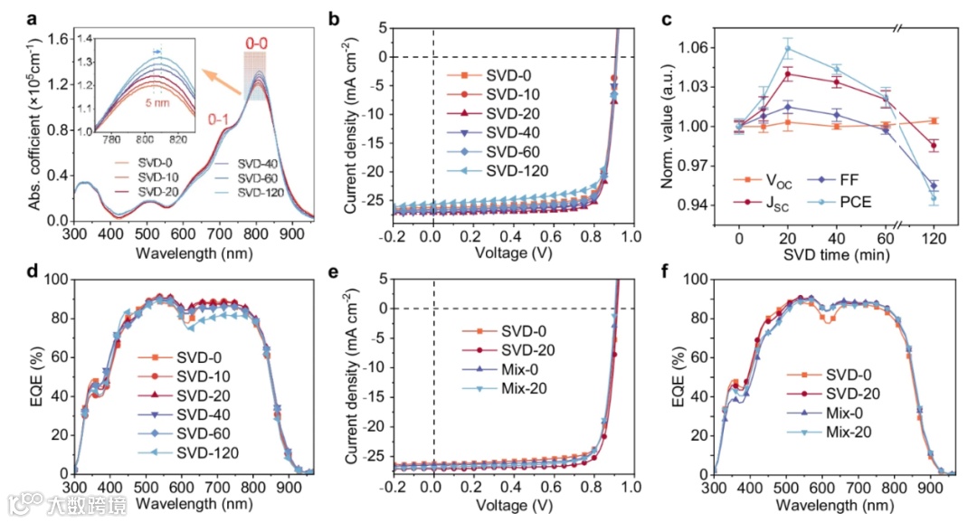 图2.a 不同溶剂蒸汽扩散(SVD)时长的溶液所制备 L8-BO 薄膜的吸收系数光谱,b 采用不同 SVD 时长处理的 L8-BO 所制备有机太阳能电池(OSCs)的电流-电压(J-V)曲线,c 归一化的开路电压(Voc)、短路电流密度(Jsc)、填充因子(FF)及光电转换效率(PCE)随 SVD 时长的变化曲线,d 采用不同 SVD 时长处理的 L8-BO 所制备有机太阳能电池的外量子效率(EQE)光谱,e 采用 Mix-0、Mix-20、SVD-0 及 SVD-20 工艺处理的 L8-BO 所制备有机太阳能电池的J-V曲线,f 采用 Mix-0、Mix-20、SVD-0 及 SVD-20 工艺处理的 L8-BO 所制备有机太阳能电池的 EQE 光谱