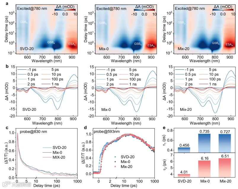 图 4.a 不同工艺条件下制备的 D18/L8-BO 薄膜的飞秒瞬态吸收等高线图,b 对应于图 a 得到的瞬态吸收光谱图,c 830 nm 波长下测得的瞬态吸收动力学曲线,d 593 nm 波长下测得的瞬态吸收动力学曲线,e 通过拟合 593 nm 波长下的瞬态吸收动力学曲线估算得到的空穴转移时间