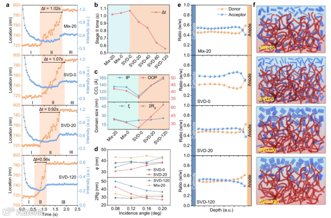 图3.a 不同工艺条件下,从二维时间分辨原位吸收光谱中提取的 L8-BO 吸收峰位置及强度的演变曲线,b 从时间分辨原位吸收光谱中提取的第二阶段时长,c 由掠入射广角 X 射线散射(GIWAXS)计算得到的晶体相干长度(CCL),以及由掠入射小角 X 射线散射(GISAXS)测得的给体相和受体相畴尺寸,d 由掠入射透射小角 X 射线散射(GTSAXS)确定的受体相畴尺寸(2Rg)及混合相占比(φ),e 由薄膜深度依赖光吸收光谱得到的光活性层内不同深度处的组分分布曲线, f 不同光活性层中垂直相分离的示意图(红色纤维代表聚合物给体 D18,蓝色纤维代表受体 L8-BO)