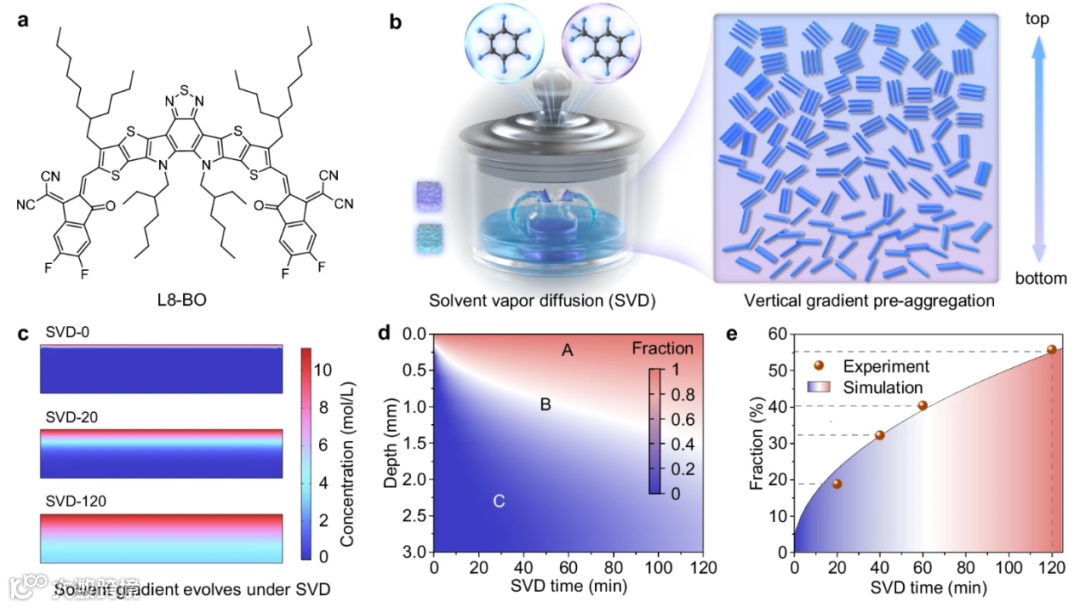 图 1.a L8-BO 的化学结构式,b 溶剂蒸汽扩散(SVD)工艺实现溶液中受体预聚集垂直梯度调控的示意图,c COMSOL 仿真得到的 SVD 过程中苯浓度梯度演变图,d 溶液中苯/甲苯占比的空间分布随 SVD 时长变化的仿真结果图,e 溶液中苯占比随 SVD 时长变化的仿真与实验对比演变曲线。