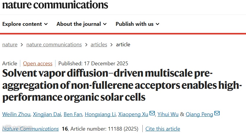 近日,四川大学徐小鹏&彭强教授团队在Nature Communications发表题为“Solvent vapor diffusion–driven multiscale pre-aggregation of non-fullerene acceptors enables high-performance organic solar cells”的研究论文。该团队开发了一种基于溶剂蒸汽扩散(SVD)的调控策略,通过精准调控非富勒烯受体在溶液中的多尺度预聚集行为,实现LbL工艺下有机太阳能电池活性层形貌的精准优化,与器件性能提升。