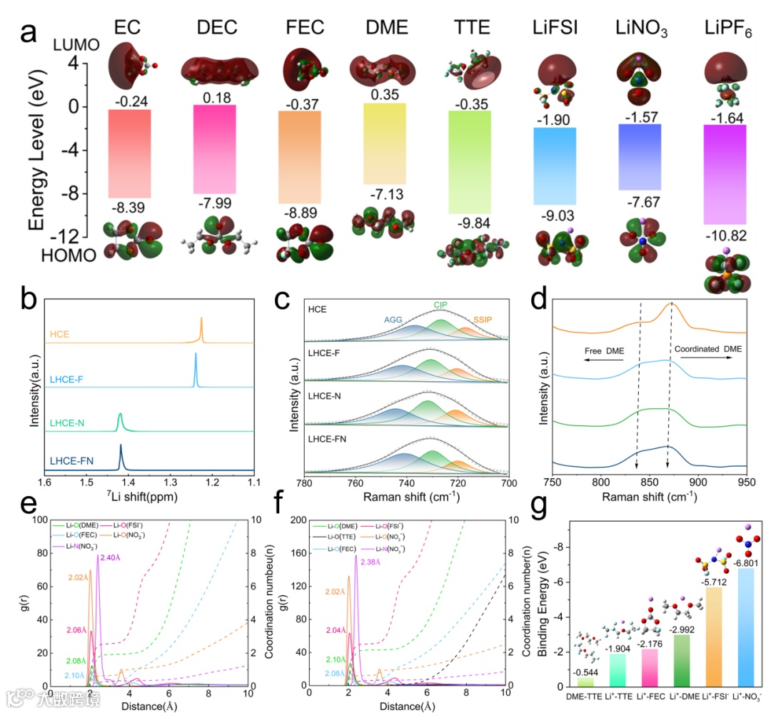 Figure 1. a) HOMO-LUMO level of different molecules. b) 7Li NMR spectra. c, d) Raman spectra. e, f) The radial distribution functions of HCE and LHCE-FN. g) Binding energies between components.