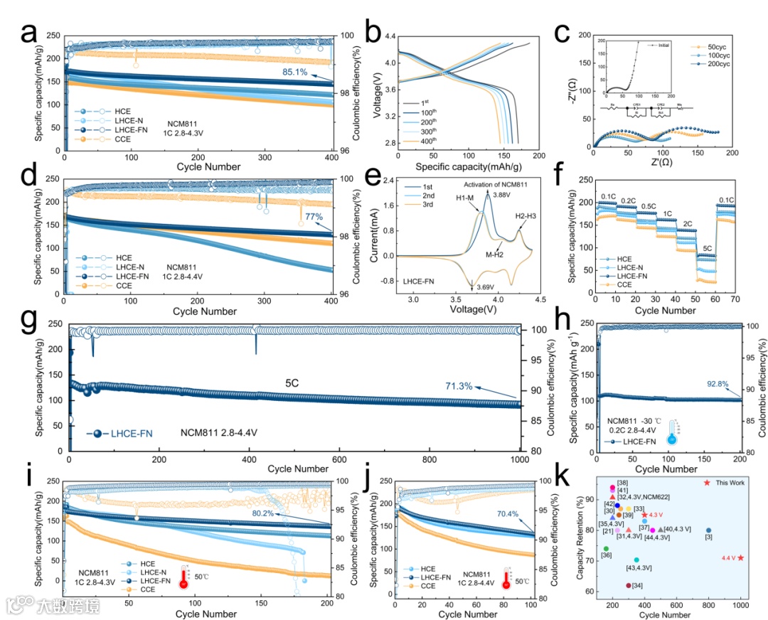 Figure 3. a, b) Cycling performance of the Li-NCM811 cells at 1 C, 4.3V, 25℃ and the corresponding voltage profiles of LHCE-FN. c) EIS analysis of Li-NCM811 cells assembled by LHCE-FN electrolyte at different cycles. d) Cycling performance of the cells at 1 C, 4.4V, 25℃. e) CV curves for the first three cycles with LHCE-FN electrolyte. f) Rate performance. Cycling performance of cells assembled by LHCE-FN electrolyte g) 5C, 4.4 V, 25℃; h) 0.2C, 4.4 V, -30℃; Cycling performance of the cells at i) 1 C, 4.3V, 50℃; j) 1 C, 4.4V, 50℃. k) Comparison of cycling performance of this work with literatures.