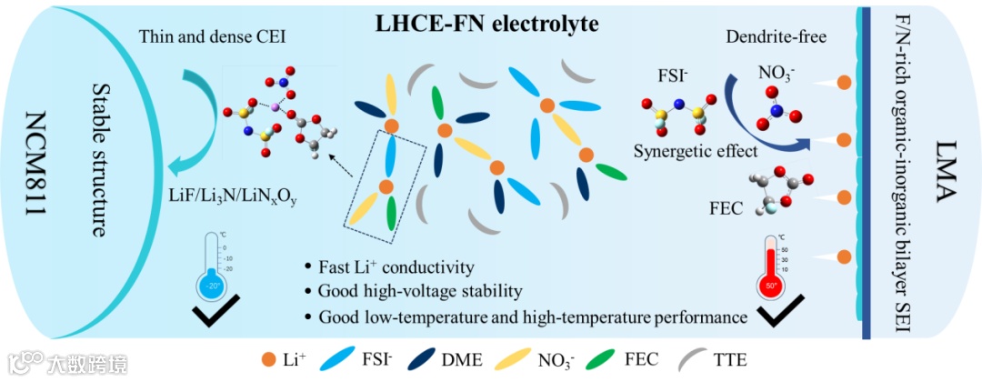 图1. 使用 改性的电解液组装的 Li||NCM811 电池的溶剂化结构及相应的界面化学示意图。