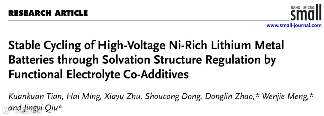 近日,题目为“Stable Cycling of High-Voltage Ni-Rich Lithium Metal Batteries through Solvation Structure Regulation by Functional Electrolyte Co-Additives”的文章在国际知名期刊Small上发表,该文章北京化工大学赵东林教授与军事科学院孟闻捷、邱景义团队共同完成,第一作者为硕士研究生田宽宽。文章通过在1,2-二甲氧基乙烷中同时引入氟代碳酸乙烯酯和硝酸锂(LiNO3)作为协同添加剂,并以1,1,2,2-四氟乙基-2,2,3,3-四氟丙基醚作为稀释剂构建了一种新型的局部高浓度电解液。最终,锂离子的溶剂化结构被合理调控,电极-电解液界面经过精心设计有效地抑制了锂枝晶的生长并保护正极结构免受损伤。
