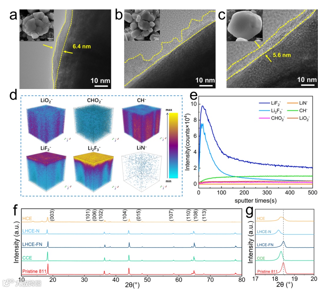 Figure 5. a, b, c) The SEM images of NCM811 cathode after 50 cycles in HCE, LHCE-N, and LHCE-FN, respectively. d) TOF-SIMs analysis of NCM811 surface after cycling in LHCE-FN. e) Normalized TOF-SIMS depth profiles of NCM811 LHCE-FN. XRD patterns of pristine NCM811 and cycled NCM811 f) full spectrum g) in (003) peak.