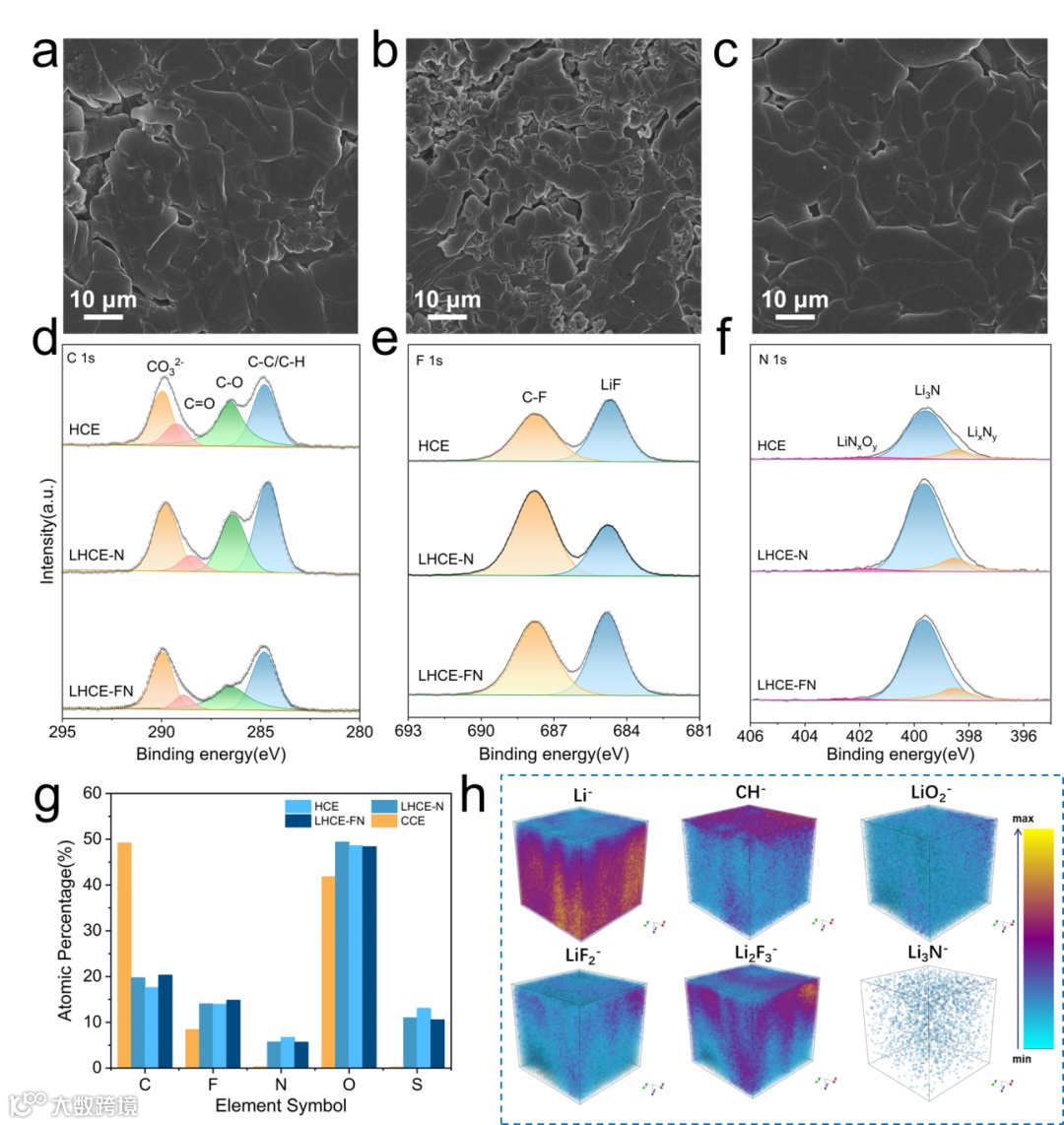 Figure 4. a, b, c) The SEM images of deposited Li after 50 cycles in HCE, LHCE-N and LHCE-FN, respectively. d-g) XPS analysis of LMA after 50 cycles. h) TOF-SIMs of LMA surface after 50 cycles in LHCE-FN.