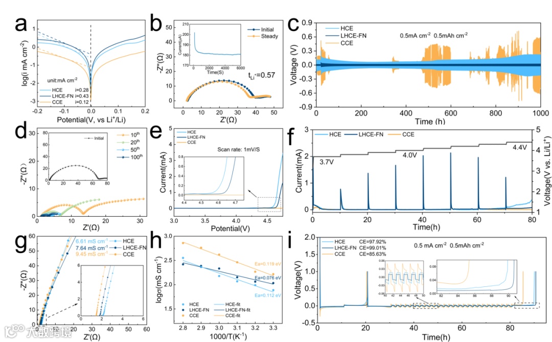 Figure 2. a) Tafel plots of Li-Li symmetric cells. b) Li+ transfer number of LHCE-FN electrolyte. c) Voltage distributions of Li-Li cells at 0.5 mA cm-2, 0.5 mAh cm-2. d) Li-Li cells cycling EIS analysis for different number of cycles. e) LSV curves. f) Electrochemical floatation analysis of Li-NCM811 cells. g) The ionic conductivity of different electrolytes. h) The calculated value of activation energy. i) The average CE of Li-Cu cells.