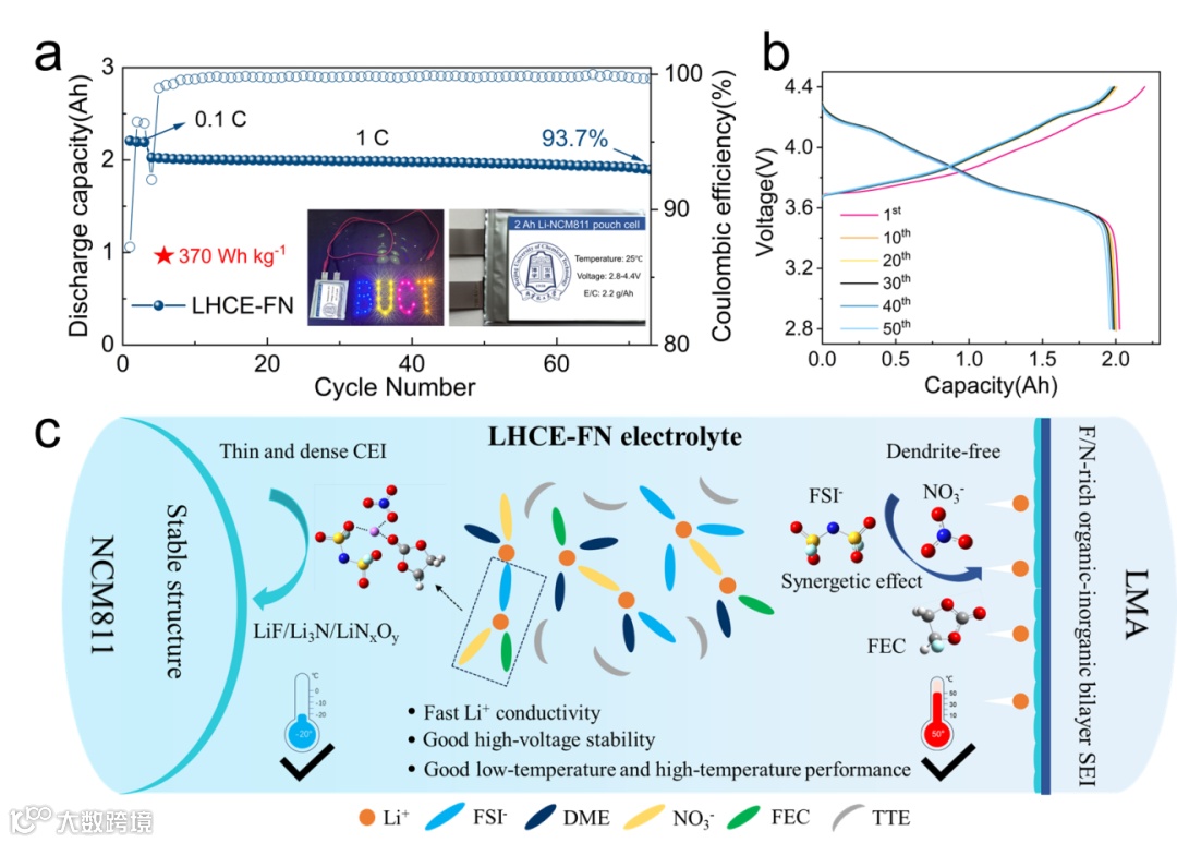 Figure 6. a) Cycling performance of Li||NCM811 pouch cell assembled with LHCE-FN Electrolyte at 1 C, 4.4 V, 25℃. b) Corresponding voltage profiles at different cycles. c) Schematic representation of the solvation structure and the corresponding interfacial chemistry of Li||NCM811 cells assembled using LHCE-FN electrolyte.