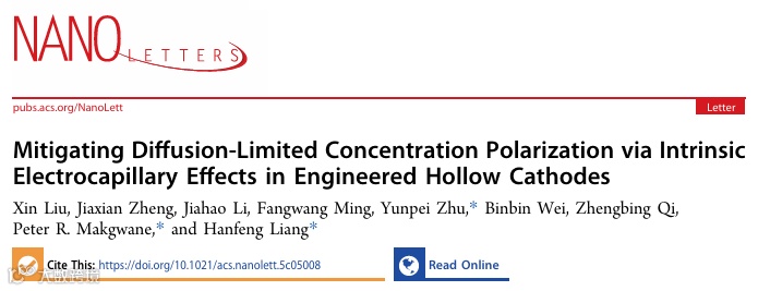 近日,厦门大学梁汉锋副教授团队联合沙特国王科技大学朱云培博士、南非大学 Peter R. Makgwane 教授,在国际知名期刊 Nano Letters 上发表题为“Mitigating Diffusion-Limited Concentration Polarization via Intrinsic Electrocapillary Effects in Engineered Hollow Cathodes”的研究论文。该工作创新性地将电毛细效应引入正极设计,通过构建海胆状空心纳米管 MnO2(H-MnO2)正极极形成纳米毛细管网络,主动调控界面传质过程,破解了水系锌离子电池的浓差极化难题。