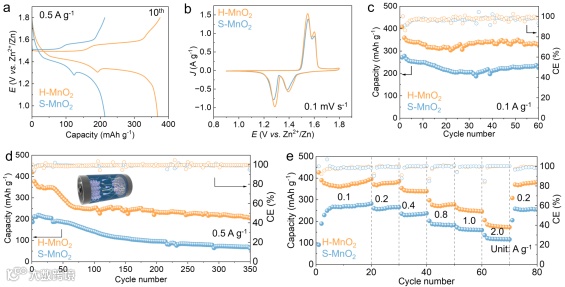 基于 H- MnO2正极的锌离子电池展现出卓越的综合电化学性能:在 0.1 A g⁻1 电流密度下,可逆容量高达 407 mAh g⁻1,远超 S- MnO2的 271 mAh g⁻1;在 2.0 A g⁻1高倍率条件下,仍保持 180 mAh g⁻1的优异容量;在 0.5 A g⁻1 循环 350 圈后,容量稳定在 200 mAh g⁻1以上,库仑效率接近 100%,且具有出色的可逆性,高倍率循环后容量可快速恢复。