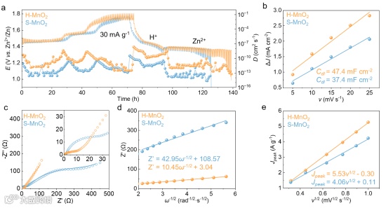 图 4 (a) GITT曲线和扩散系数分布. (b) 双电层电容评估. (c) Nyquist图. (d) ω-1/2~Z‘线性关系图. (e)v1/2~Jpeak线性关系图.
