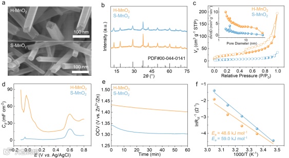 设计合成了海胆状空心纳米管 MnO2(H-MnO2)阴极材料,与传统实心纳米棒 MnO2(S-MnO2)形成对照。H-MnO2具有超大比表面积(81.95 m2 g⁻¹)和丰富孔容(0.3023 cm3 g⁻1),其空心纳米管结构不仅缩短了离子扩散路径,更构建了高效的纳米毛细管网络,为电毛细效应的发挥提供了结构基础,从设计源头突破传统材料的传质局限。