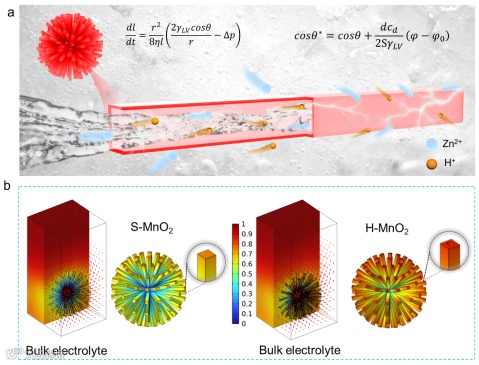水系锌电池凭借安全性高、成本低廉、环境友好等核心优势,成为电网级大规模储能领域的潜力候选技术。然而,其发展长期受困于电荷载体(H+和 Zn2+)固态扩散动力学迟缓、电极-电解质界面浓差极化严重等问题,导致电池容量衰减快、倍率性能不佳,极大限制了商业化应用进程。受到电毛细管效应促进电解质润湿的启发,采用中空结构有望提升正极的扩散动力学,进而缓解浓差极化,实现高容量和高倍率性能的电池。