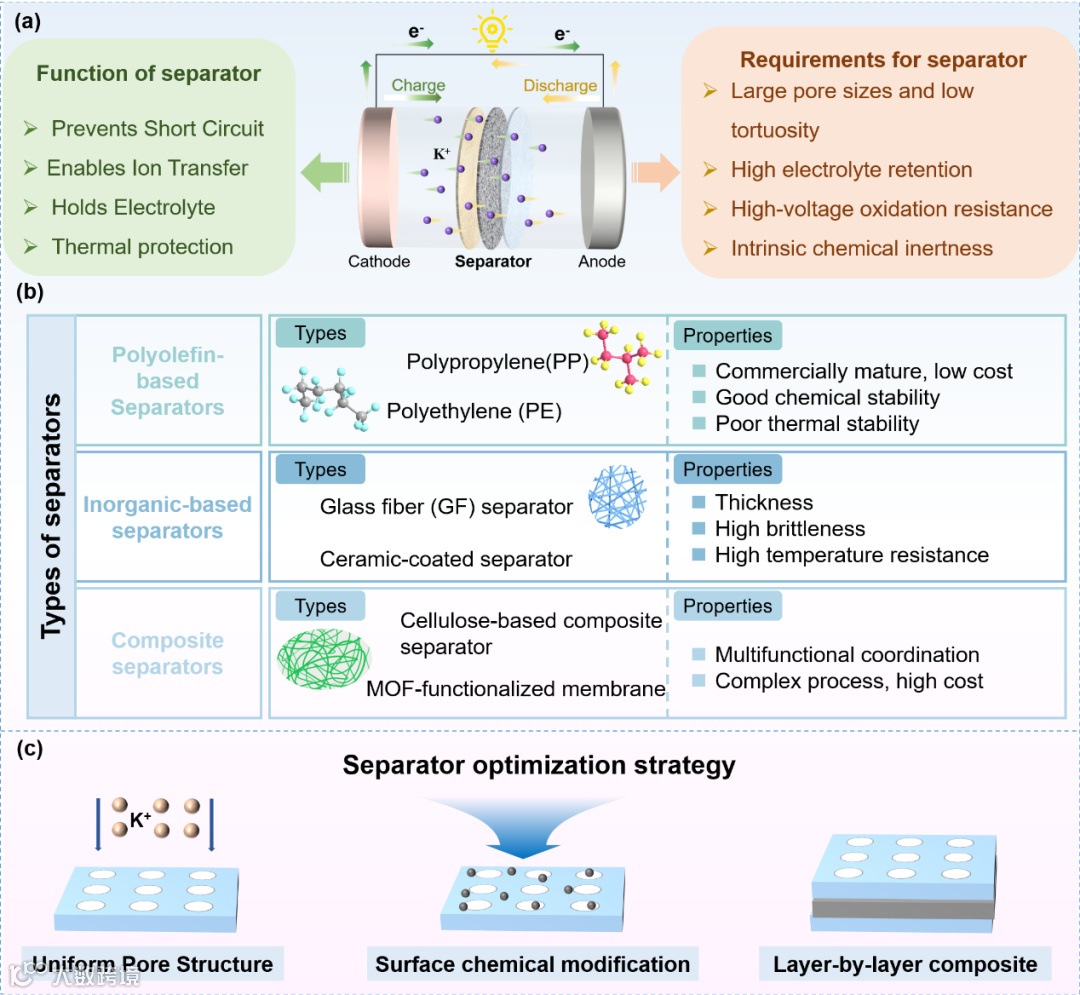 图6.(a)隔膜在PIBs中的功能及要求;(b)隔膜种类;(c)隔膜优化策略。