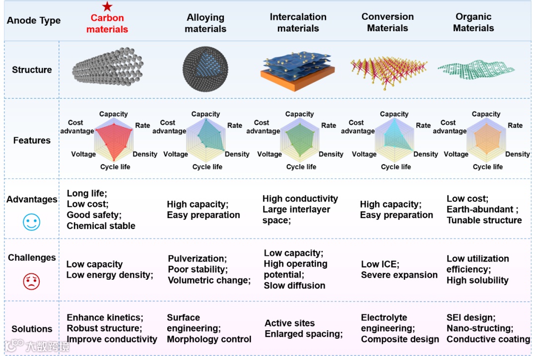 图3. PIBs负极材料的结构、性能、优缺点比较及改进方案。