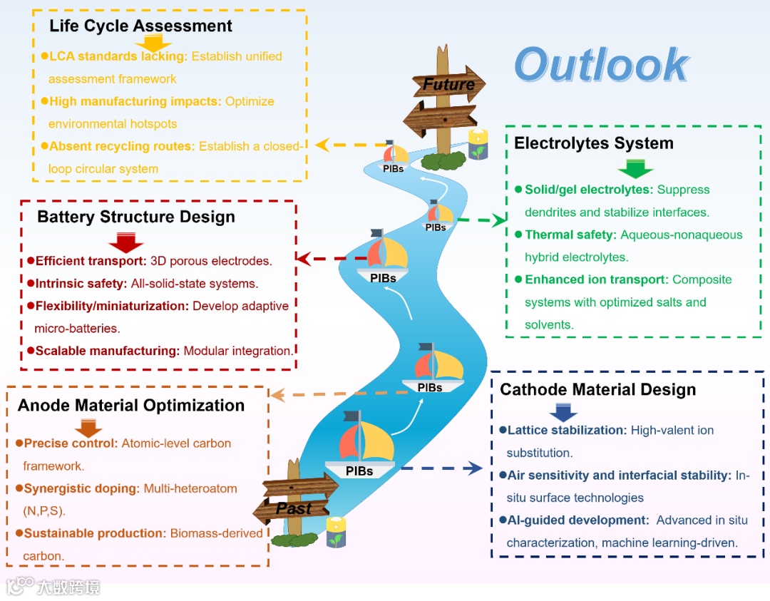 尽管PIBs有望凭借高性能与低成本优势在未来能源体系中获得更广泛应用,但其商业化仍处于起步阶段,材料体系与电池系统在稳定性、安全性和工程适配性等方面仍存在明显短板。面向发展需求,未来研究亟需在关键技术上持续加大投入(图9),通过系统性优化不断提升钾离子电池的综合性。在材料层面,低成本、高容量的铁基和锰基层状氧化物正极,以及与现有LIBs体系高度兼容的石墨和碳材料负极,仍是最具现实潜力的技术路线,但必须通过结构稳定化、界面调控和精细化结构设计来克服循环衰减与环境敏感等问题。在体系层面,更安全、高稳定性的电解液与固态/凝胶体系,以及面向高集成度和多功能化的电池结构设计,将成为提升可靠性和应用适应性的关键支撑。同时,从可持续发展的角度看,建立面向PIBs的完整生命周期评价体系,降低材料合成与制造过程中的能耗和碳排放,并推动回收与再利用技术的发展,是实现应用不可或缺的一环。PIBs的商业化并非单一材料或性能指标的突破,而是材料设计、电池工程与可持续制造协同演进的结果。通过聚焦工程化可行性和真实应用场景,PIBs有望在规模储能、低温与高功率应用以及成本敏感型市场中形成具有竞争力的解决方案,逐步从实验室研究走向实际应用。